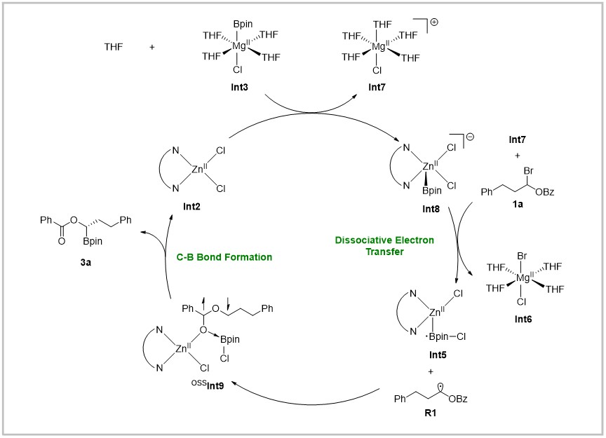 基于机理实验以及DFT计算,作者提出了可能的反应机理。首先,Int3的Bpin基团转移至Zn(II)复合物Int2,生成THF稳定的Mg(II)阳离子Int7和阴离子复合物Int8。接着从Int8到底物1a发生解离电子转移,产生自由基R1、复合物Int5和溴负离子;随后溴负离子与Int7结合生成Int6。之后,R1的羰基部分与Int5的锌原子配位形成开壳层单重态Zn(II)中间体Int9,紧接着C-B键形成,释放产物并再生Int2完成整个催化循环。