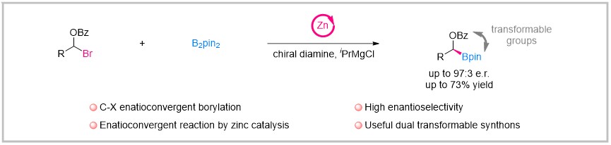 近期,南京大学刘超课题组报道了锌催化α-苯甲酰烷基溴化物的对映收敛硼化反应。该反应利用廉价锌/手性二胺作为催化剂,联硼酸频那醇酯/异丙基氯化镁作为硼试剂,首次实现了锌催化的对映收敛转化,以较好的对映选择性以及收率得到一系列手性的烷基硼酸酯化合物。