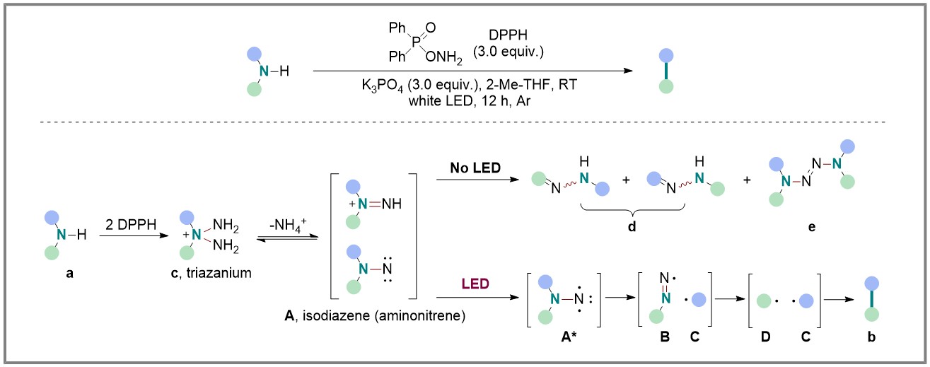 基于机理实验结果,推测的反应机理如下。在碱性条件下,仲胺与DPPH反应生成氮鎓中间体c,该中间体随后生成单线态异二氮烯A。在无光照条件下,A会二聚生成四氮烯e,或者重排为腙d。而在可见光照射下,异二氮烯A被激发生成单线态激发态异二氮烯A*,随后发生均裂,生成烷基二氮烯自由基B和烷基自由基C。烷基二氮烯自由基B进一步发生第二次断解,释放出氮气,并形成烷基自由基D,后者与自由基C自由基偶联,最终得到脱氮原子产物b。