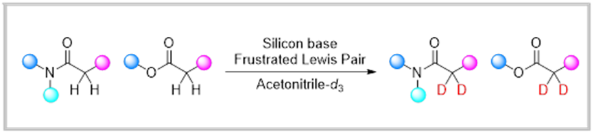 近日,日本九州大学的T. Ohshima教授利用硅Lewis酸/Brønsted碱协同催化剂作为受阻Lewis酸碱对(FLP)催化氢同位素交换,在温和条件下高选择性地实现了酰胺和酯的α-氘化反应,从而制备了一系列具有多种官能团且氘化率高的氘化酰胺和酯。